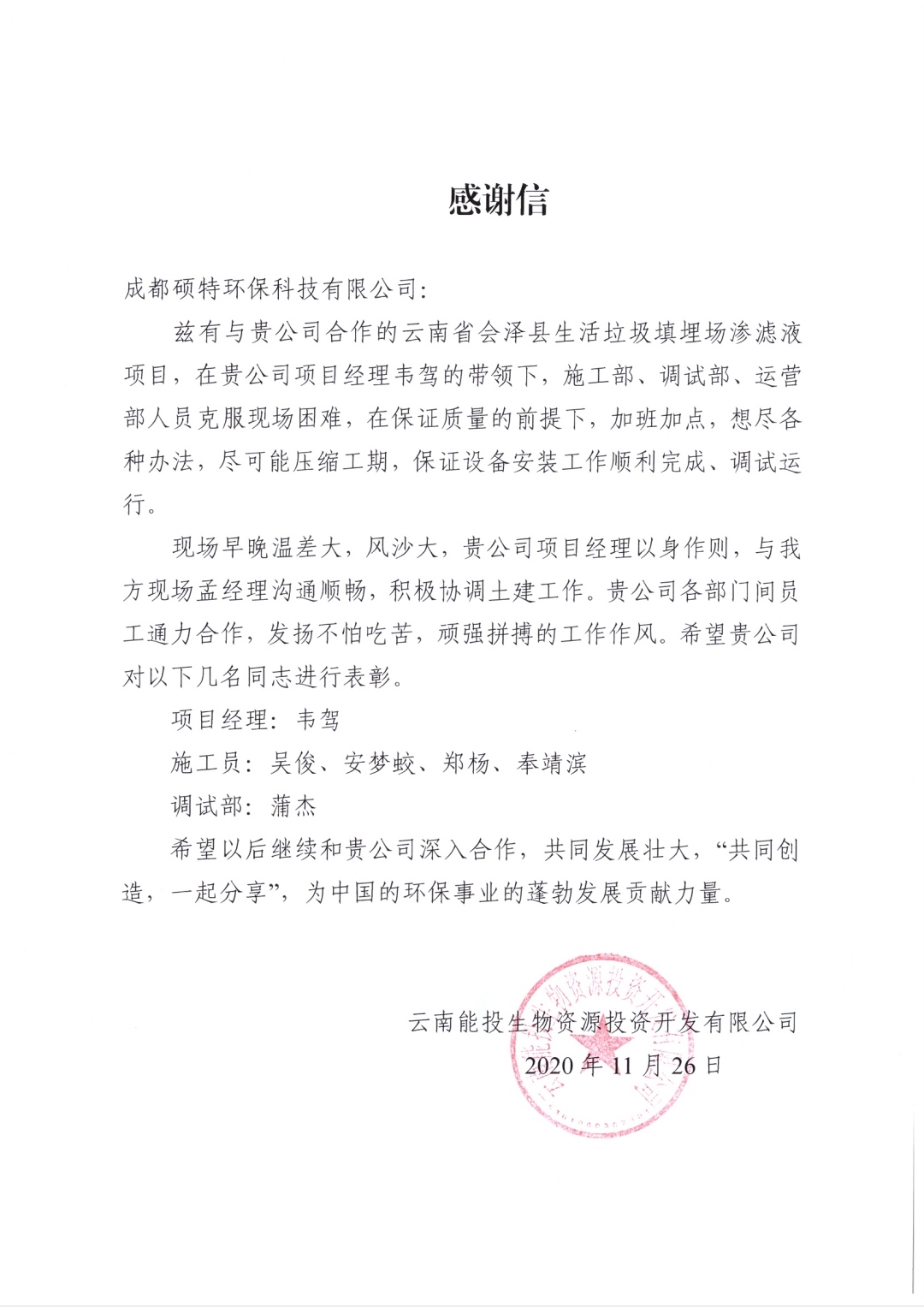 現(xiàn)場(chǎng)人員效率高、不怕臟、不怕累、敢于吃苦的工作態(tài)度得到業(yè)主的高度認(rèn)可,在安裝工作結(jié)束后,云能集團(tuán)領(lǐng)導(dǎo)特意給會(huì)澤項(xiàng)目組發(fā)來(lái)一封感謝信。
