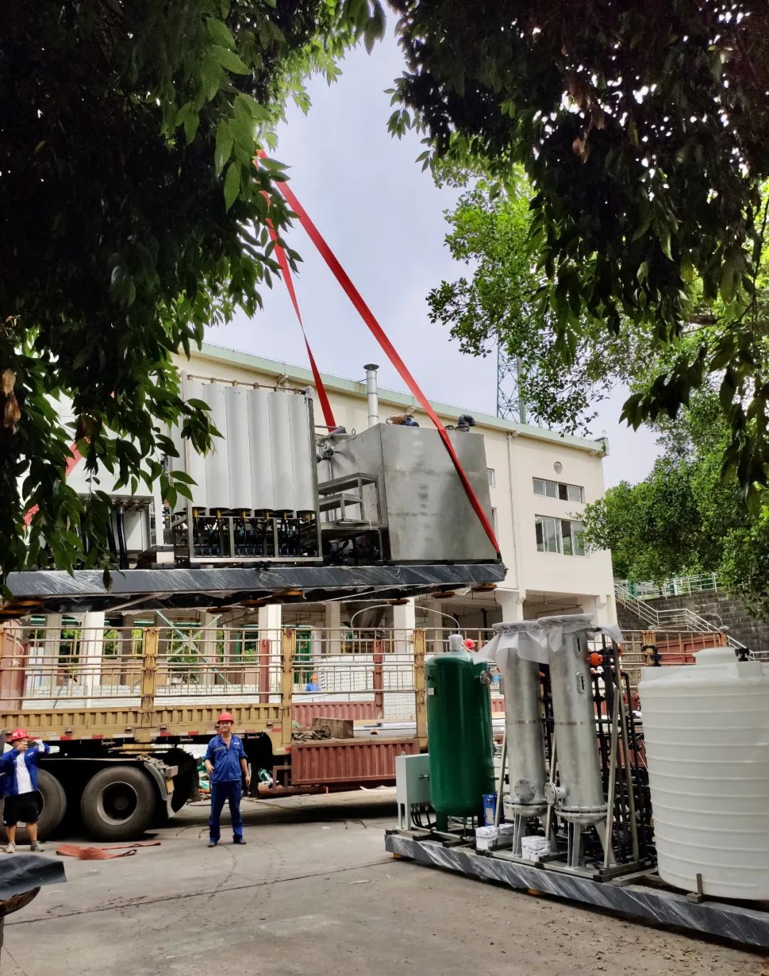 在安裝就位過程中,由于設(shè)備車間空間小,導(dǎo)致設(shè)備挪運難度大,整個過程異常艱難,但碩特環(huán)保忠縣項目人員始終堅持“迎難而上,堅持到底”的原則,發(fā)散思維,就地取材,最終在土建方及業(yè)主的大力配合下,順利完成了就位工作。