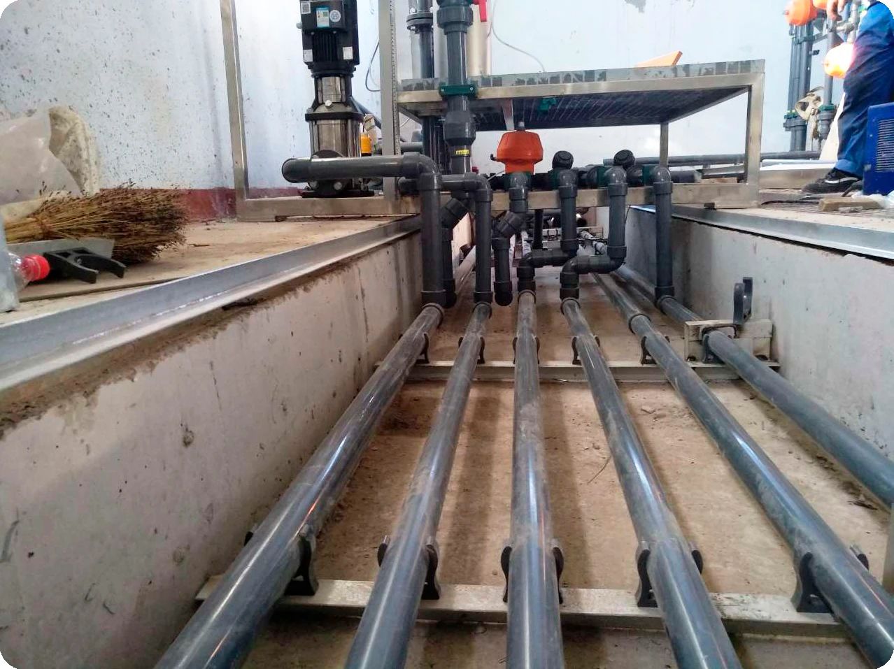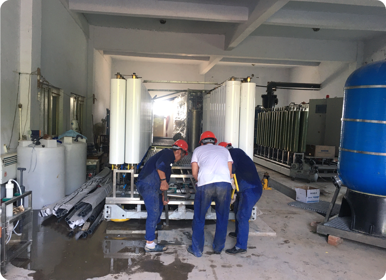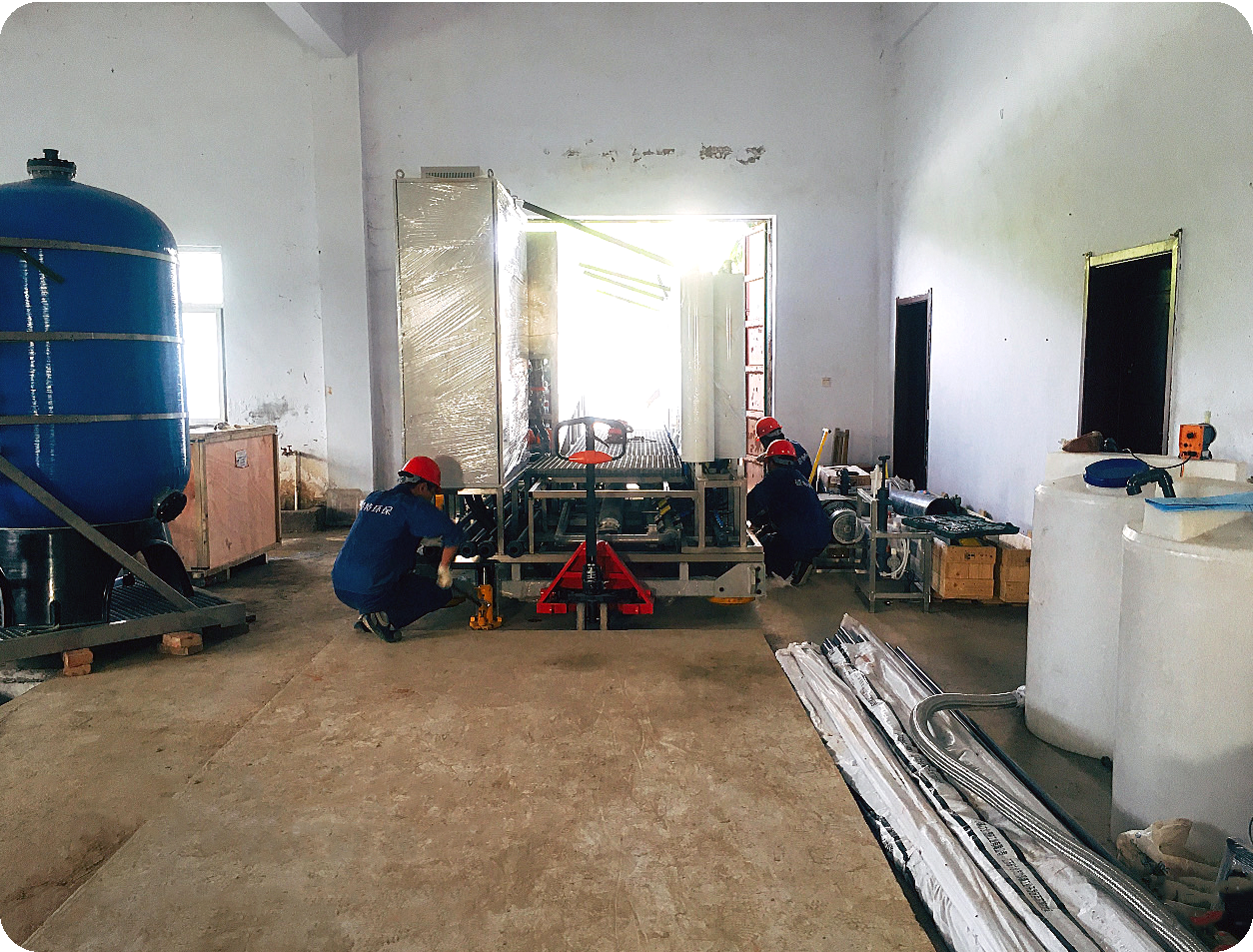 在項目負責人的帶領下,項目部施工員們緊張有序地開展著后續(xù)各項工作。在設備安裝過程中因業(yè)主膜車間空間受限,設備只能從膜車間門口用專業(yè)搬運器具一點點將設備安裝到已制作好的設備基礎上。搬運過程中項目部施工員們不怕苦、不怕累,在組長的帶領下安全、有效地完成設備就位工作,充分體現出現場施工員們對解決困難問題的積極態(tài)度和對工作的高度專業(yè)性。