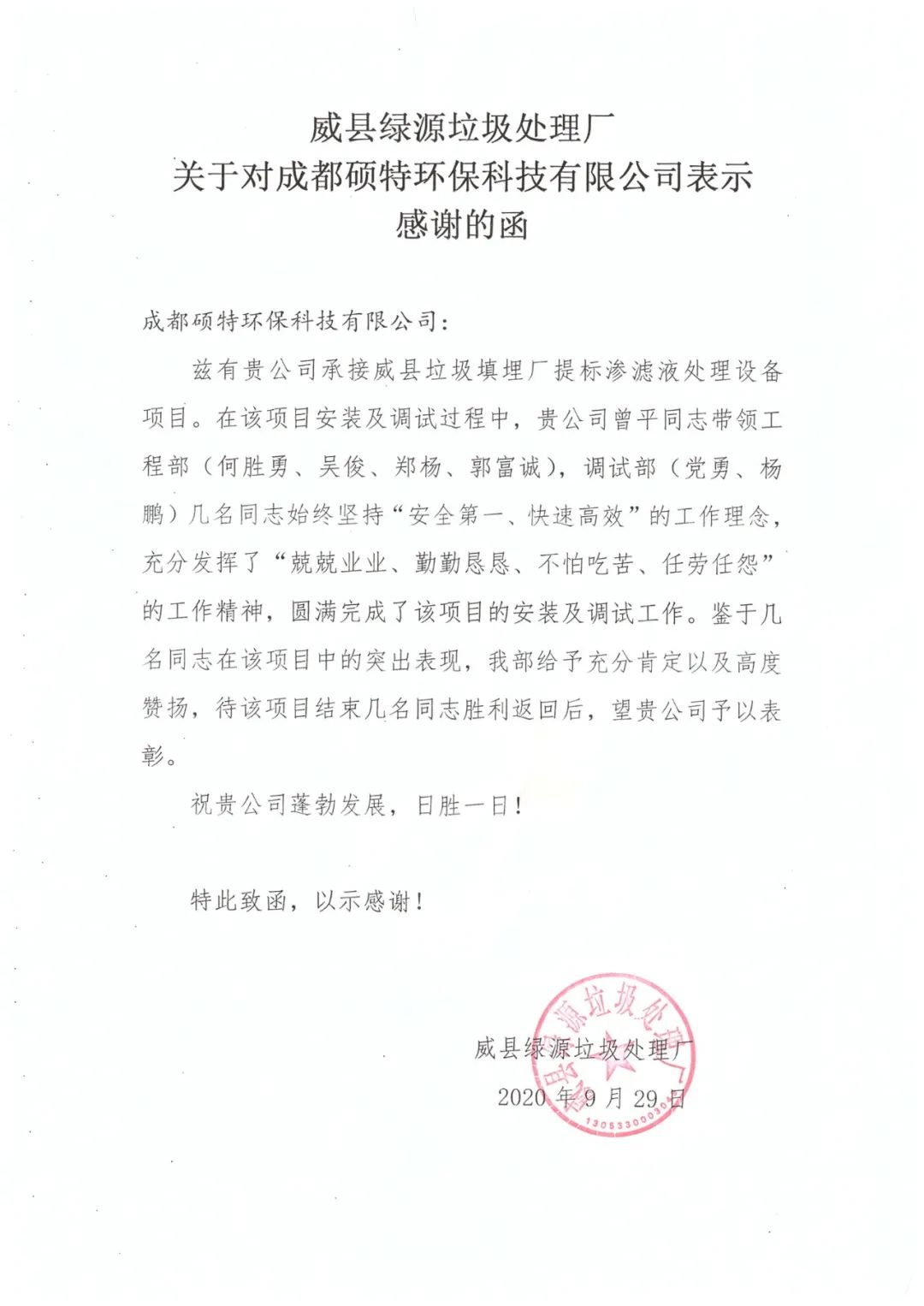 曾平半年來(lái)主持參與公司云南漢盟項(xiàng)目、河北威縣填埋場(chǎng)填埋區(qū)域雨污分流改造工程項(xiàng)目,參與貴陽(yáng)比例壩垃圾填埋場(chǎng)滲濾液應(yīng)急處理項(xiàng)目、都昌縣生活垃圾焚燒發(fā)電項(xiàng)目滲濾液處理系統(tǒng)機(jī)電安裝工程,其中河北威縣項(xiàng)目得到了業(yè)主的一致好評(píng),并向碩特環(huán)保發(fā)送感謝函。