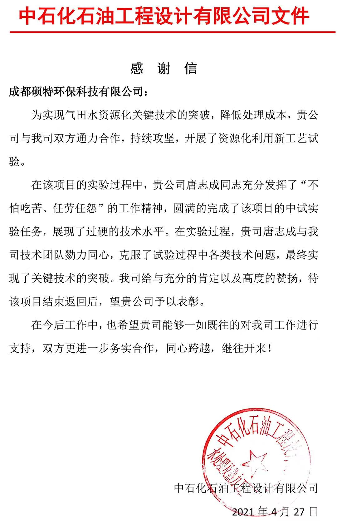 2020年12月入職至今,作為公司技術(shù)骨干,唐志成常駐試驗(yàn)現(xiàn)場(chǎng),積極配合中國(guó)石化技術(shù)團(tuán)隊(duì),主動(dòng)深入技術(shù)研究,克服試驗(yàn)過(guò)程中各類(lèi)技術(shù)問(wèn)題,有效降低處理成本,實(shí)現(xiàn)氣田水資源化關(guān)鍵技術(shù)的突破,2021年4月唐志成得到中石化石油工程設(shè)計(jì)有限公司的充分肯定和高度贊揚(yáng),值得公司各位同事學(xué)習(xí)!