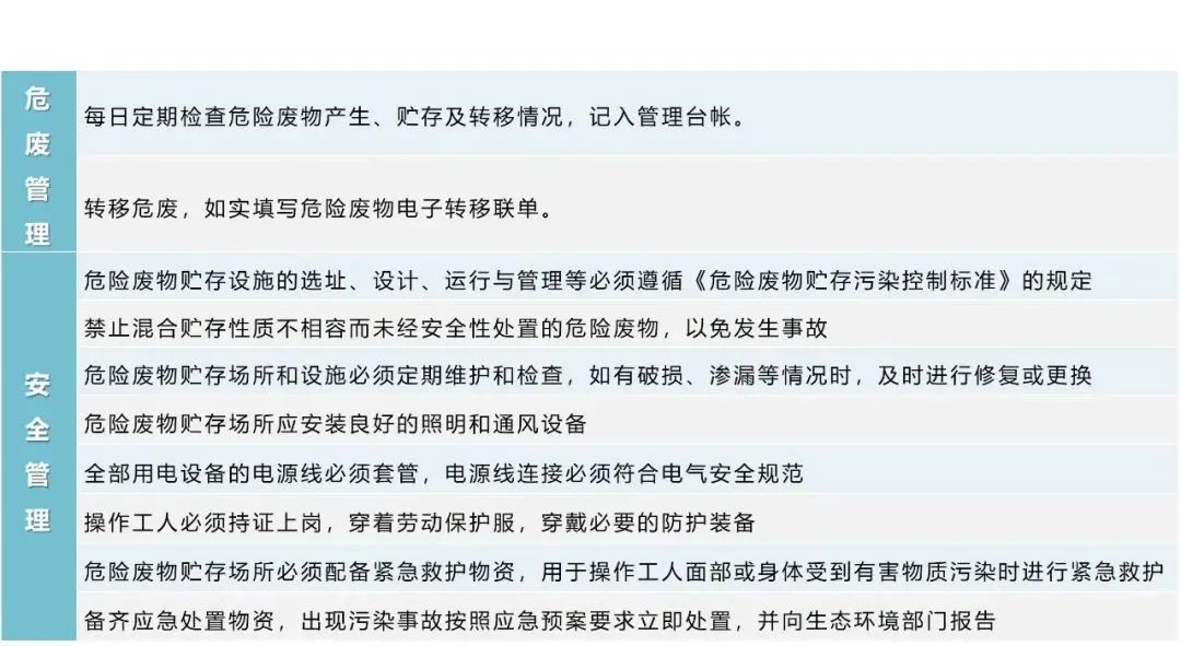 企業(yè)應(yīng)建立危險(xiǎn)廢物管理制度,明確危險(xiǎn)廢物管理的部門與責(zé)任人。明確危險(xiǎn)廢物處置的目標(biāo)指標(biāo),建立危險(xiǎn)廢物來源清單和危險(xiǎn)廢物處置商及處置情況清單。企業(yè)應(yīng)制定危險(xiǎn)廢物收集、貯存現(xiàn)場(chǎng)防滲、防泄漏、防雨等措施并規(guī)范實(shí)施,處置應(yīng)選擇有資質(zhì)單位并進(jìn)行危險(xiǎn)廢物轉(zhuǎn)移計(jì)劃備案,備案通過后,如實(shí)填寫“危險(xiǎn)廢物轉(zhuǎn)移聯(lián)單”并存檔。